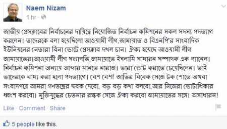জাতীয় প্রেস ক্লাবের নির্বাচন নিয়ে যত কথাজ্যেষ্ঠ সাংবাদিক ও বাংলাদেশ প্রতিদিন পত্রিকার সম্পাদক নঈম নিজাম ফেসবুকে একটি স্ট্যাটাস দিয়েছেন। এতে তিনি লিখেছেন, ‘জাতীয় প্রেসক্লাবের নির্বাচনের দায়িত্বে নিয়োজিত নির্বাচন কমিশনের সকল সদস্য পদত্যাগ করলেন। তাদেরকে বলা হয়েছিলো আওয়ামী লীগ,জামায়াত ও বিএনপি’র সাংবাদিক ইউনিয়নের নেতারা বিনা ভোটে প্রেসক্লাব দখল চান। ঐক্য হয়েছে আওয়ামী লীগ জামায়াতের।আওয়ামী লীগ সভাপতি,জামায়াতে ইসলামি সাধারন সম্পাদক এক প্যানেল। নির্বাচন কমিশনা অন্যায় আব্দার মানতে নারাজ। তারা ভোট করাতে চেয়েছিলেন। তাই তাদেরকে বাধ্য করা হলো পদত্যাগে। বেশ বেশ! জাতির বিবেক সেজে টক শোতে অথবা সংবাদপত্রে আমরা গণতন্ত্রের ছবক দেবো, বড় বড় কথা বলবো,আর নিজেরা ভোটাধিকার ধ্বংশ করবো। মুক্তিযুদ্ধের চেতনার রক্ষক সেজে ঐক্য করবো জামায়াতের সঙ্গে। অসাধারন!’