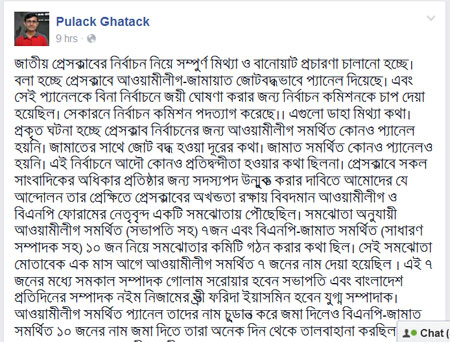 জাতীয় প্রেস ক্লাবের নির্বাচন নিয়ে যত কথাডেইলি অবজারভারের সিনিয়র রিপোর্টার পুলক ঘটক ফেসবুকে একটি স্ট্যাটাস দিয়েছেন। তিনি লিখেছেন, জাতীয় প্রেসক্লাবের নির্বাচন নিয়ে সম্পুর্ণ মিথ্যা ও বানোয়াট প্রচারণা চালানো হচ্ছে। বলা হচ্ছে প্রেসক্লাবে আওয়ামীলীগ-জামায়াত জোটবদ্ধভাবে প্যানেল দিয়েছে। এবং সেই প্যানেলকে বিনা নির্বাচনে জয়ী ঘোষণা করার জন্য নির্বাচন কমিশনকে চাপ দেয়া হয়েছিল। সেকারনে নির্বাচন কমিশন পদত্যাগ করেছে। এগুলো ডাহা মিথ্যা কথা।