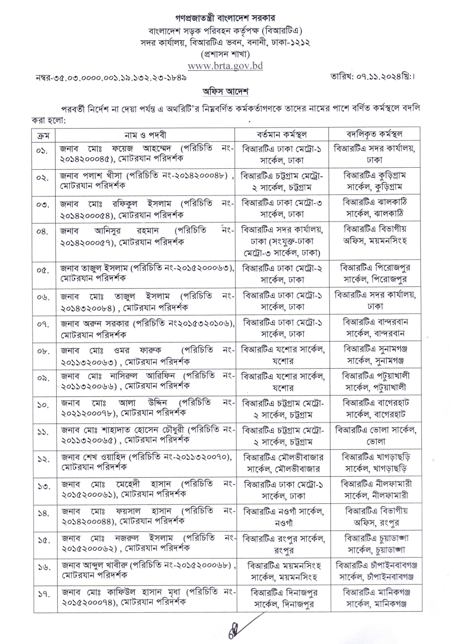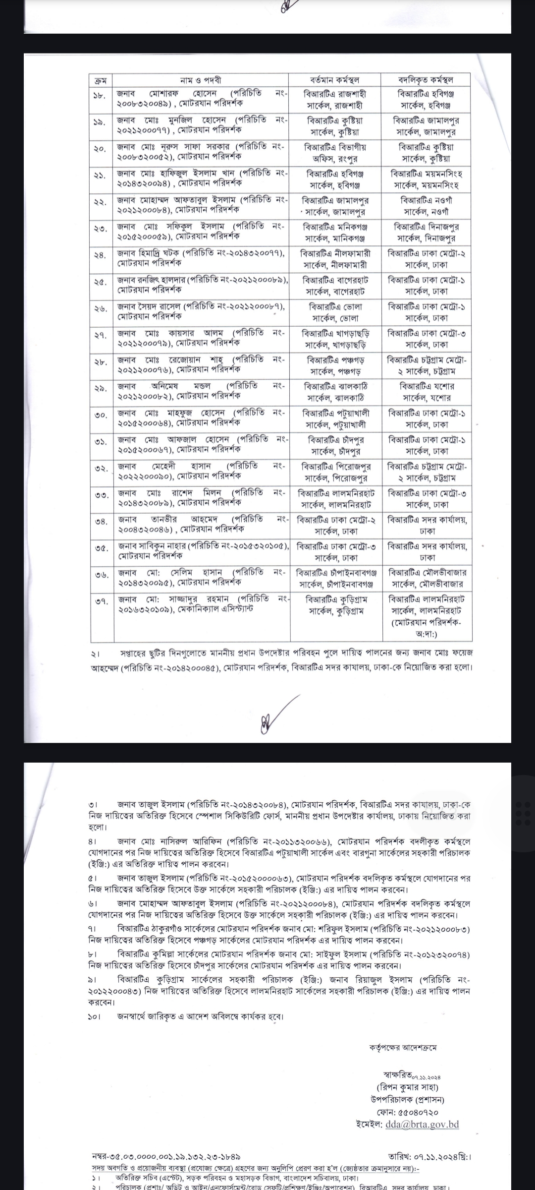 দ্বিতীয়বারের মতো একসঙ্গে ৩৭জন মোটরযান পরিদর্শক কে লটারি প্রক্রিয়ার মাধ্যমে বদলি করেছে বাংলাদেশ সড়ক পরিবহন কর্তৃপক্ষ (বিআরটিএ)। তাদের দেশের বিভিন্ন বিআরটিএ সার্কেল ও বিভাগীয় অফিসে বদলি করা হয়েছে। বৃহস্পতিবার (৭-১১-২৪ইং) উপপরিচালক (প্রশাসন) রিপন কুমার সাহা সই করা অফিস আদেশে এই বদলির নির্দেশনা দেয়া হয়।