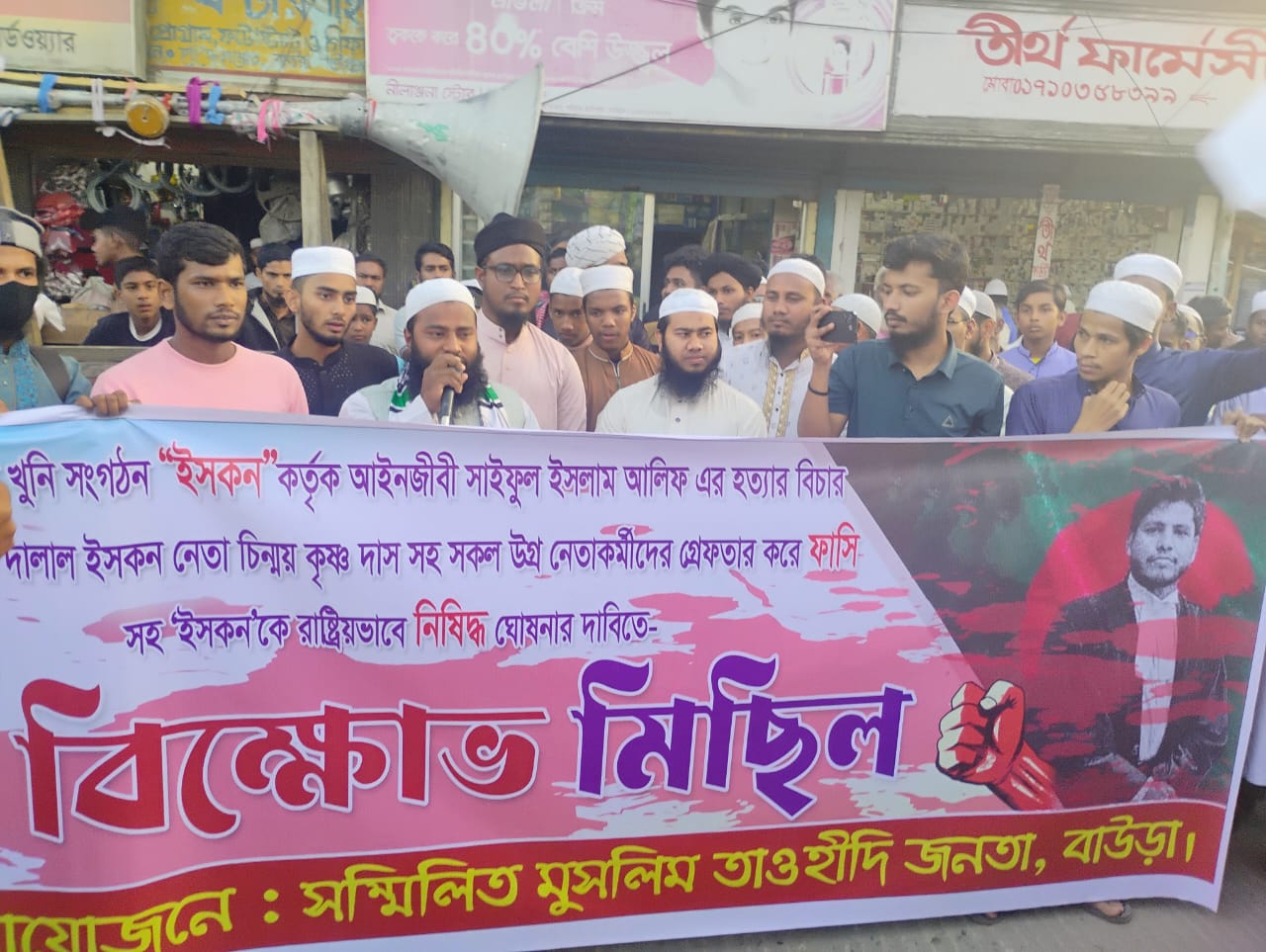 আনিছুর রহমান (পাটগ্রাম)প্রতিনিধি চট্টগ্রামে উগ্রবাদী সংগঠন ইসকনের সন্ত্রাসীদের হামলায় এডভোকেট সাইফুল ইসলাম হত্যার প্রতিবাদে লালমনিরহাটের পাটগ্রাম উপজেলাধীন বাউড়া ইউনিয়ন এ