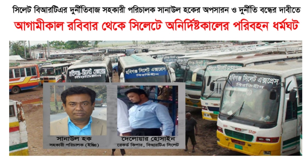 বিআরটিএর দুর্নীতিবাজ এডি সানাউল হকের অপসারনের দাবীতে সিলেটে পরিবহন ধর্মঘট